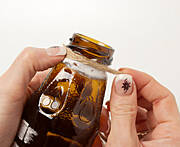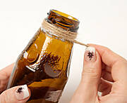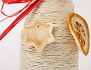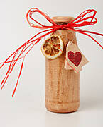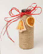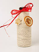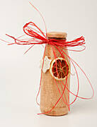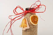 Gdy cała butelka jest dokładnie owinięta sznurkiem, możesz ją zakręcić i ozdobić kokardą z rafii, plastrami suszonych cytrusów oraz zawieszkami z masy solnej. Zakrętkę dwukrotnie pomaluj farbą akrylową, nawet tą najwyklejszą - do malowania ścian. Najlepszy efekt uzyskasz, używając do malowania kawałka obciętej gąbki do mycia naczyń, którą po zanurzeniu w farbie będziesz raz za razem dociskać do powierzchni zakrętki. Pamiętaj, że przed kolejnym malowaniem pierwsza warstwa musi wyschnąć. Proces wysychania można przyspieszyć, używając suszarki do włosów. Po pomalowaniu zakrętkę powinno się pomalować lakierem, ale tylko zewnętrzną warstwę, która nie będzie miała kontaktu z zawartością butelki. Podobna zasada dotyczy wcześniejszego malowania farbą.