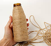 Przy pomocy pędzelka smaruj butelkę wikolem i owijaj sznurkiem. Rób to etapami, dzięki temu klej nie zdąży wyschnąć, a Ty się nie pobrudzisz.