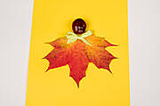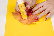 Materiały gotowe? W takim razie zaczynamy! Najpierw smarujemy klonowy liść klejem i przyklejamy go do kartki, aby uzyskać jesienną sukienkę. Wstążeczkę zawiązujemy tak, aby powstała kokardka i przyklejamy u nasady liścia za pomocą mocno wiążącego kleju, kleju pistoletowego lub kuleczki plasteliny. W podobny sposób mocujemy kasztanową główkę.