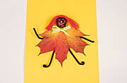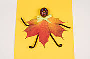 Z wyciorka wykonujemy rączki i nóżki ludzika - lekko je zginając lub zawijając na końcach. Wyciorki wystarczy wsunąć pod liść posmarowany klejem i lekko docisnąć. Jeszcze tylko wełniane włoski przymocowane na warstwę kleju i kasztanowa dziewczynka z sukienką liścia gotowa.