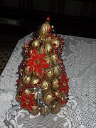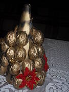 Orzechy kilka dni wcześniej spryskujemy sreberkiem lub złotkiem i pozostawiamy, aby wyschły.Z kartonu robimy stożek, sklejamy go klejem na gorąco lub zszywamy zszywaczem, i za pomocą pistoletu klejowego naklejamy na kartonowy stożek pomalowane , wyschnięte orzechy, zaczynając od szerokiej dolnej podstawy.