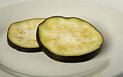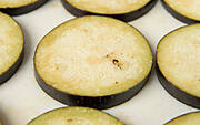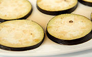 Bakłażana myjemy, kroimy w plastry i obsypujemy z obu stron warstwą soli. Zostawiamy bez przykrycia na około 30 minut. Pod wpływem soli warzywo puści sok. Po mniej więcej 10 minutach pojawią się pierwsze wyraźne krople wilgoci, po kolejnym kwadransie plastry bakłażana będą zanurzone w małych kałużach soku. Odciskamy go bardzo dokładnie za pomoca papierowego ręcznika. Bakłażan jest gotowy do przyrządzenia. Oczywiście już go nie solimy.