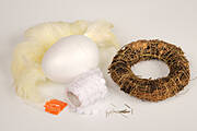 Będziemy potrzebować styropianowego jajka, gotowego zakupionego w sklepie gniazdka lub własnoręcznie zrobionego gniazdka uwitego np. z ozdobnego grubego sznurka, taśmy z wszytymi piórkami przypominającej boa, kwiatuszków materiałowych w postaci taśmy do cięcia, drobnych koralików oraz szpilek.