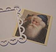 Obrazek z mikołajkiem docinamy do kwadratu, z bezowego papieru również wycinamy kwadrat, ale ciut większy nić obrazek z mikołajkiem.