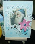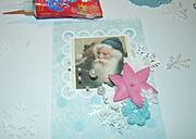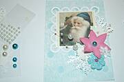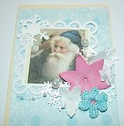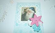 Na początek do niebieskiego papieru przyklejam ramkę z mikołajkiem, a następnie ozdobne kwiatki.
