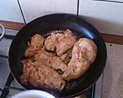 Rozgrzewamy bardzo mocno patelnię, obsmażamy piersi na suchej patelni z całym dobrodziejstwem marynaty z obu stron po dwie minuty.