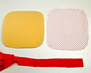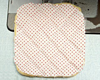 Z szarego papieru wytnij kwadratowy szablon o zaokrąglonych brzegach o wymiarach ok. 25x25 cm. Nałóż szablon na gąbkę o grubości ok. 0,5 cm (zamiast gąbki możesz też wykorzystać ocieplinę), wytnij. Następnie, wykorzystując papierowy szablon, wykrój kwadrat z podwójnie złożonego materiału. Przygotuj też materiał na lamówkę. Możesz do tego celu wykorzystać ten sam materiał lub inny w kontrastrowym kolorze. Paski materiału przeznaczone na lamówkę powinny być cięte ze skosu (czyli ukośnie do prostego kierunku nitek wątku i osnowy) i mieć ok. 4 cm szerokości.