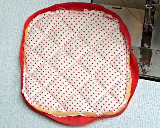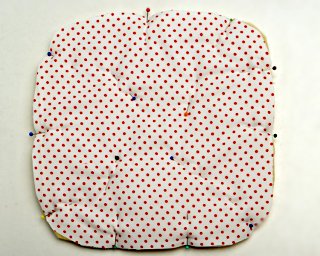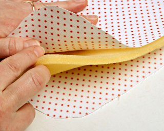 Połóż jedną warstwę materiału lewą stroną do góry. Nałóż gąbkę. Przykryj drugą warstwą materiału prawą stroną do góry. Zanim wszystko złączysz szpilkami, upewnij się, czy prawe strony znajdują się na zewnątrz.