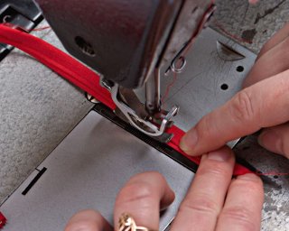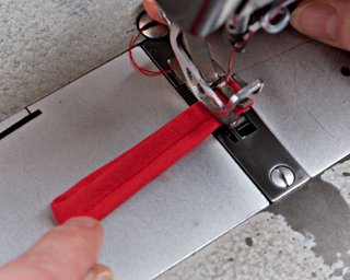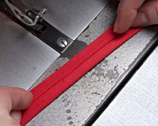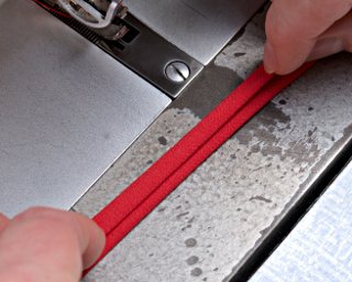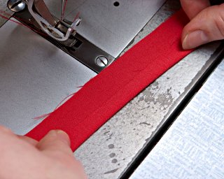 W trakcie pracy palcami układaj i przytrzymuj materiał, aby odpowiednio ułożył się pod stopką maszyny. W razie potrzeby podnoś stopkę, wówczas lepiej się układa lamówka.