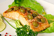 1/2 kg filetu z łososia norweskiego ze skórą, 3 łyżki oliwy, 1/2 łyżeczki soli morskiej, 18 małych zielonych oliwek, kilkanaście pączków kaparów z solanki, świeżo zmielony kolorowy pieprz, szczypta ostrej sproszkowanej papryki, kilka kropli świeżo wyciśniętego soku z cytryny