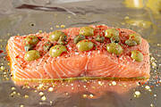 Płat łososia umyć, oczyścić, skórę pozbawić łusek (najłatwiej skrobać pod niedużym strumieniem bieżącej zimnej wody za pomocą ostrego noża). Rybę podzielić na 3-4 porcje. Folię aluminiową posmarować oliwą. Rybę oprószyć solą morską, świeżo zmielonym kolorowym pieprzem, ostrą papryką w proszku, skropić sokiem z cytryny, ułożyć pączki kaparów i połówki oliwek. Zawinąć boki folii, tworząc paczuszkę. Tak przygotowane porcje ryby przełożyć na blachę do pieczenia. Piec w termoobiegu, w temp. ok. 190 st. C przez ok. 20 minut. Pięć minut przed końcem pieczenia rozchylić folię, aby odparował nadmiar płynu. Czas pieczenia jest orientacyjny i trzeba go dostosować do wielkości porcji i grubości filetów. Ryba powinna pozostać wilgotna w środku.