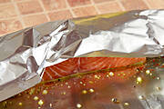 Powodów jest wiele. Po pierwsze ten sposób jest bardzo wygodny - porcje ryby można przygotować wcześniej, opakować w folię i odłożyć do lodówki w oczekiwaniu na moment wstawienia do piekarnika. Później, po upieczeniu z łatwością przełożymy je na talerze gości. Po drugie, dzięki pieczeniu w folii, mięso łososia nie wysuszy się, lecz pozostanie wilgotne, dusząc w sokach wytworzonych podczas obróbki cieplnej. To bardzo smaczna metoda pieczenia ryby, ponieważ bez problemu możemy kontrolować konsystencję i dostosowywać ją do gustów gości. Elastyczność to trzeci i najważniejszy argument przemawiający za wykorzystaniem folii aluminiowej. Duszona czy zrumieniona? Spytaj gości, jaką rybę wolą. Jeśli duszoną, piecz filety do końca szczelnych paczuszkach. Jeśli zrumienioną, pod koniec pieczenia mocno rozchyl folię na boki, pozwalając odparować płynom. Ryba zamknięta w folii długo utrzymuje ciepło, co daje nam czas na przygotowanie pozostałych składników, jeśli jeszcze się z nimi nie uporaliśmy.