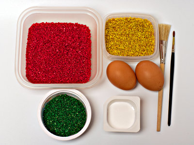 1. Przygotuj materiały. Ustaw pojemniczki z zabarwioną kaszę jęczmienną - będziesz w nich zanurzać jajka. Przelej gęsty wikol do wygodnego naczynka. Poszukaj pędzelków do malowania wikolowych wzorków na jajku. Jajka możesz użyć plastikowego, ugotowanego na twardo lub wydmuszki. Zaplanuj, jak chcesz ozdobić jajko. Połóż na stole coś, co ochroni blat przed ubrudzeniem i bierz się do pracy.