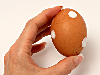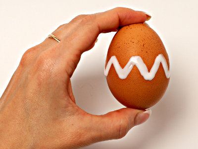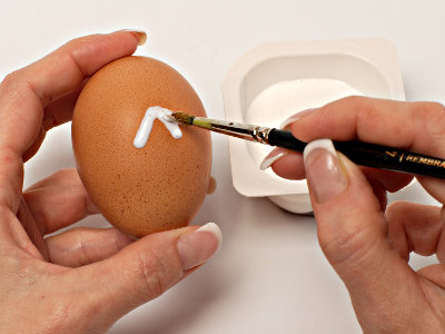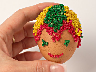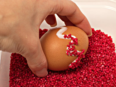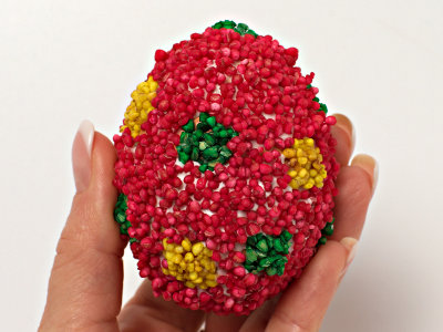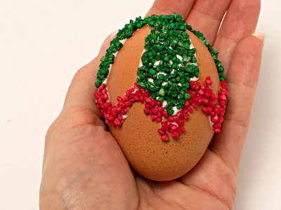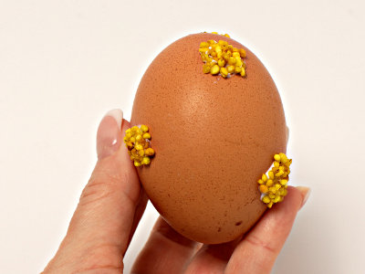 2. Gdy już naniesiesz wybrany wzorek na jajko (szlaczek powinien być dość szeroki, a klej nakładany stosunkowo grubą warstwą, w przeciwnym razie trudno będzie nakleić kaszę), zanurz je w kaszy. Jeśli ziarna nie przykleją się dokładnie, doklej je palcami, wciskając je w klej. Odczekaj około 15 minut z kolejnym etapem ozdabiania - klej musi dobrze związać, aby ziarenka kaszy nie poodpadały. Pamiętaj o dokładnym myciu i suszeniu pędzelka po zakończeniu każdego etapu smarowania klejem. Wikol, który zaschnie jest bardzo trudny do usunięcia.