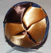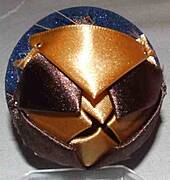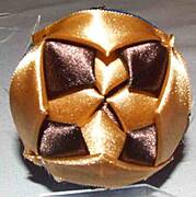 krok 1 na środku kuli przypinamy szpilkami kwadracik wstążeczki |