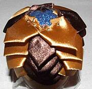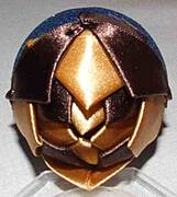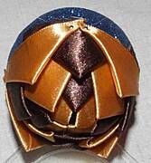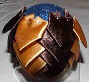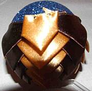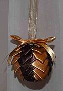 krok 20 kokardkę przypinamy do czubka bombki. Szpilki wbijamy pod skrzydełko kokardki z obu stron |
