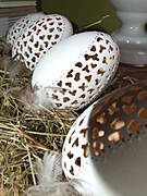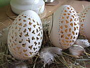 Zaczynamy.....na wydmuszce wyrysowujemy wzór ołówkiem....jesli coś poszło nie tak zmazujemy gumką lub myjemy wodą z płynem do mycia naczyń i zaczynamy szlifowanie (maseczka na twarz bo pyli, i okulary na oczy bo czasem odłamek moze nas trafic) Nie zrażamy sie, że poprzez nasze wyciete ażurki prześwituje błonka jaja.