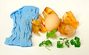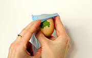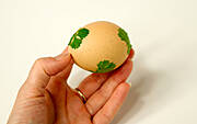 Przygotowujemy jajka, cebulowe łuski, czyste rajstopy lub pończochy (aby nie ponosić dodatkowych kosztów, najlepiej wykorzystać uszkodzone), natkę pietruszki, koperek lub innye zioła o ciekawym kształcie liści, oraz rondelek z wodą. Jajka dokładnie szorujemy pod bieżącą wodą - skorupki muszą być idealnie czyste, aby równomiernie się zabarwiły. Listki smarujemy klejem i przyklejamy w wybranych miejscach skorupki.