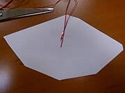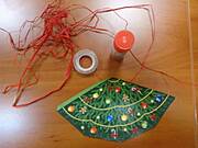 2. Wyciąć kawałek wstążki lub sznurka. Zawinąć w formę pętelki ze sznurkiem i taśmą klejącą przykleić na białej stronie tak aby sznurek wystawał od góry drzewka. (można również ten punkt pominąć i drzewko będzie śliczną ozdobą stołu).