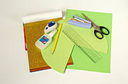Przygotujcie zielony brystol w formacie A3, zieloną kartkę A4, ozdobną (np. pokrytą brokatem) kartkę w dowolnym kolorze, ołówek, linijkę, nożyczki, klej, zszywacz, ozdobny dziurkacz.