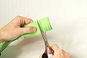 Kartkę A4 potnijcie na paski o szerokości około 4 cm. Każdy z nich ponacinajcie dość gęsto, a powstałe choinkowe igiełki-paseczki wywińcie, przeciągając po nich kilkukrotnie ostrzem nożyczek. Część pasków, która nie została nacięta smarujcie klejem i oklejajcie stożek z brystolu rzędami od dołu ku górze.