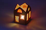 Narysuj na kartce własny wzór lampionu, wydrukuj dowolny pomysł znaleziony w Internecie lub skorzystaj z szablonu, który dla Ciebie przygotowaliśmy (możesz go ściągnąć tutaj >>>). Wytnij otwory na okna oraz drzwi, podłogę odrysuj od jednej z kwadratowych ścianek. Możesz wymyślać dowolne kształty okien i drzwi i zmieniać wielkość okienek.