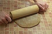 Ciasto podziel na kilka części. Mniejsze kawałki łatwiej wałkować na placki o grubości kilku milimetrów. Nie zapomnij posypywać blatu mąką, żeby ciasto nie przykleiło się do stołu i do wałka.