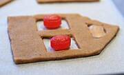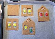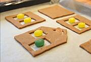 Wyłóż blachę papierem do pieczenia i ostrożnie wszystko na nią przełóż. Zostaw odstępy między ściankami, ponieważ pierniki trochę urosną. Do każdego okienka włóż jedną landrynę. Jeśli okienko jest małe, włóż tylko połówkę pokruszonego cukierka.