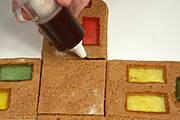 W kubku wymieszaj blenderem pół szklanki cukru pudru, ½ łyżeczki gorzkiego kakao, 1 łyżkę wody i 10 kropli aromatu rumowego lub migdałowego. Składniki miksuj przez kilka minut. Jeśli lukier będzie za rzadki, dosypuj więcej cukru pudru, jeśli będzie za gęsty, dolewaj po kilka kropelek wody. Gotowy lukier przełóż łyżeczką do szprycy i wyciśnij go w miejsce klejenia piernikowym ścianek.