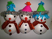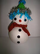 Z obydwu kul ścinamy nożem kawałek "góry" na płasko i za pomocą pistoletu sklejamy kule jedna do drugiej płaskimi miejscami. Następnie robimy bałwankowi czapeczkę. Z brystolu robimy stożek, oklejamy bibułą i dekorujemy. Gotową czapeczkę przyklejamy za pomocą pistoletu na górną mniejszą kulę, czyli głowę bałwanka. Robimy oczy z guzików, nos z plasteliny i mocujemy za pomocą pistoletu. Z materiału lub wstążeczki robimy szaliczek, przyklejamy guziczki lub pompony na brzuszek. Bałwanek gotowy! Prawda, że łatwo go wykonać?