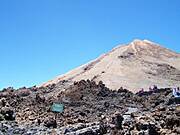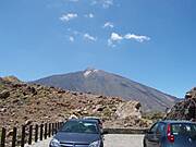 Tutaj na zdjeciu widac sam szczyt dominuje tu przedewszystkim pumeks,ktory jest bardzo delikatny,aby wjechac na sam szczyt musimy sie dostac mniej wiecej na 2500m autem badz innym srodkiem lokomocji,jesliby ktos chcial skorzystac z tranportu publicznego powinien wsiasc w autobus#384 zaczynajacy trase w Peurto de la Cruz,ewentualnie pieszo,ale wtedy to nie bedzie wycieczka na jeden dzien i musimy sobie zapewnic nocleg,najlepiej sobie go wczesniej zarezerwowac,zeby uniknac rozczarowania brakiem miejsc.Od mniej wiecej 2500m jest kolejka linowa ,ktora nas zawiezie na wys.3550m.koszt od osoby 25€,w ciagu godziny musimy wrocic z powrotem,bo bilet jest tyle wazny i oczywiscie nie powinnismy zostawac tak dlugo w rozrzedzonym powietrzu.Ja sama mialam od razu bol glowy,kolatanie serca i ciezko mi sie oddychalo.Na sam szczyt te okolo 200m pokonujemy pieszo,z glownej drogi biegnacej przez Park Narodowy wydaje sie to latwe,ale to tylko pozory i taka wyprawe powinni podejmowac tylko wytrawni i dobrze wyposazeni piechurzy,odcinek do pokonania tylko niby 200m,ale cala trasa na sam szczyt to okolo2km na wschod od kolejki linowej,dlatego ze podloze jest pumeksowe i dosc luzne,jest przez to bardzo niebezpieczne do tego dochodzi rozrzedzone powietrze,wiec na tej wysokosci wedrowka jest wyczerpujaca.Nie kazdy moze wejsc na szyczyt do tego jest potrzebne zaswiadczenie biura Parku Narodowego,liczba takich zezwolen jest ograniczona do 150 dziennie,chetni musza okazac paszport i zapewnic ,ze nie choruja na serce,uklad krazenia lub wysokie cisnienie krwi.Wiadomo ze najlepiej wybrac sie do parku w piekny pogodny dzien,ale szczyt czesto znajduje sie i tak pod chmurami utrzymujacymi sie na wys.500-1500m.My doswiadczylismy tego ,przy wjezdzie do parku w pewnym momencie stanelismy w pelnym sloncu,zostawiajac w tyle gesta warstwe chmur i tutaj to widac---->