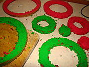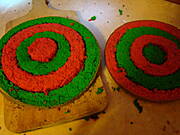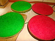 Można wykrawać z każdego ciasta oddzielnie krążki lub aby było szybciej ułożyć na sobie dwa krążki (dwa kolory) i teraz wykrawać, najpierw największą „wykrawaczkę” i nożem wzdół przy samej krawędzi wykrawaczki wyciąć koło. Następnie średnia „wykrawaczka” i postępować tak samo jak z poprzednią. Na koniec najmniejsza wykrawaczka.