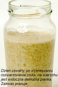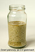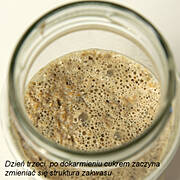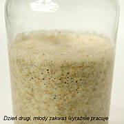 Wiele przepisów zdradzających etapy hodowania zakwasu każe łączyć ze sobą składniki w idealnie odmierzonych proporcjach. Tak naprawdę aptekarska precyzja nie jest konieczna. Zakwas to po prostu niezbyt gęsta mieszkanka mąki i wody, w której w odpowiedniej temperaturze i wilgotności namnażają się dzikie kultury drożdży. Wystarczy więc, jeśli w czystym i suchym słoiku zmieszamy pół szklanki mąki żytnio-razowej typ 2000 i pół szklanki letniej przegotowanej wody. Słoik przykrywamy gazą niejałową i odstawiamy w ciepłe miejsce. Drożdże dobrze namnażają się w temperaturze około 25-30 stopni. Po upływie 12 godzin należy zakwas dobrze przemieszać, a po kolejnych 12 godzinach dokarmić mieszanką przygotowaną z 2 łyżek mąki żytnio-razowej typ 2000 i 2-3 łyżek letniej przygotowanej wody. Słoik cały czas trzymamy w ciepłym nieprzewiewnym miejscu (zakwas źle znosi przeciągi i wahania temperatury) i co 12 godzin intensywnie krótko mieszamy. Pod koniec drugiej doby powinny już zacząć być widoczne pierwsze nieśmiałe pęcherzyki powietrza. Pojawi się też charakterystyczny kwaśny zapach. Trzeciego dnia, gdy dokarmimy zakwas mieszanką zawierającą cukier, zakwas zacznie wyraźnie się burzyć, natomiast czwartego rozpocznie się etap "małej stabilizacji". Zakwas przestanie się burzyć, bąbelkowanie będzie mniej intensywne, zauważalne może być natomiast rozwarstwianie - na dnie słoja osiądzie papka mączna, na wierzchu utworzy się wodna kałuża. Nie należy się takimi zmianami niepokoić, to naturalne, że nasz zakwas uspokaja się po kilku dniach mimo regularnego dokarmiania. Wciąż jednak powinien być wyczuwalny kwaśny zapach.