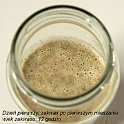 po upływie 12 godzin od ostatniego mieszania zakwas dokarmić 1 łyżką mąki żytnio-razowej oraz 1-2 łyżkami letniej przegotowanej wody, wymieszać
