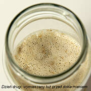 po 24 godzinach od nastawienia zakwasu dokarmić go 2 łyżkami mąki żytnio-razowej typ 2000 wymieszanej z 2-3 łyżkami letniej przegotowanej wody, wymieszać