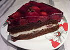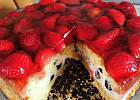 Też zrobiłam po raz kolejny. Do śmietany dałam cukru z prawdziwą wanilią, wierzch posmarowałam gęstą galaretką, na to truskawki (które też wysmarowywałam tężejącą galaretką), na to polewa czekoladowa (kombinacje wynikają z faktu, że w każdym cieście zalewanym galaretką mam ją na spodzie z rozmoczonym ciastem w komplecie