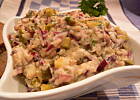 Bardzo dobre, ale właściwie to chyba zrobione "na motywach" :) Okazało się, że mam 3 korniszony, a nie chciało mi się biegać do sklepu, więc dorzuciłam 3 połówki marynowanej papryki, majonez wymieszałam z jogurtem greckim (miałam 6 płatów, więc potrzebowałam trochę więcej smarowidła), dodałam jabłko i kopiatą łyżeczkę musztardy delikatesowej.