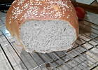 Chlebek tym razem wyszedł idealnie. Wyrastał sobie łącznie 8h, bo miałam zakwas 150% hydracji i jest jakoś słabszy. Zrobiłam z sezamem na górze i nie stwierdzam by to jakoś mocno się gryzło z chlebkiem. Chleb faktycznie delikatny i mięciutki :)