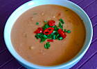 Chłodnik pyszny, orzeźwiający i wbrew temu co bahus twierdzi w dyskusji na forum a propos chłodników;) - absolutnie fenomenalny dnia następnego - smaki przeszły, żaden nie dominował, za to super się uzupełniały, czosnek złagodniał, a papryka oddała swój aromat i smak. Pierwszego dnia jadłam w wersji oryginalnej, drugiego zaś z dodatkiem papryczki chili, fety i koperku. Z czystym sumieniem i zdziwieniem zarazem muszę stwierdzić, że dodatek sera nie wpłynął na smak zupy mimo swego mocnego smaku, właściwie nie było go czuć w tej feerii smaków i aromatów.