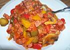 Pyszne leczo, też robię podobnie, ale zamiast mortadeli dodaję parówki cienkie pokrojone w grubsze kawałki i lekko podsmażone z cebulką. Można też dodać cukinię pokrojoną w kawałki (po wydrążeniu łyżeczką środka). Pieczarki dodaję, jak mam, bez nich też dobre.