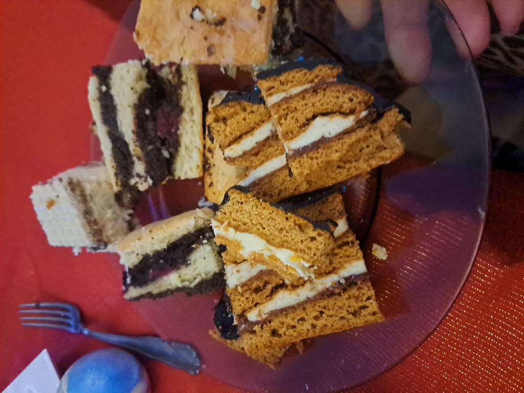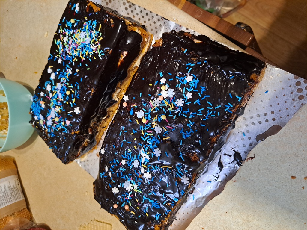 Z jedenej polowy upieklam piernik i przelozylam go masa orzechowa i powidlami z czekolada.Jak zwykle pyszne.