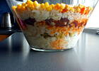 ryż-warstwa pikantnego keczupu-ogórek konserwowy-kukurydza-warsywa majonezu-curry-pierś z kurczaka z przyprawą gyros-por-ryż-sos słodko-kwaśny