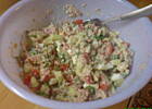 Zrobiłam ją dzień wcześniej (tzn pokroiłam wszystko, pomidory i ogórki odłożyłam na durszlak i do lodówki, tuńczyka mocno wycisnęłam a resztę pomieszałam, na następny dzień pomieszałam wszystko) i była przepyszna! Tylko, jak już pisałam, zrobiłam ją bez kukurydzy, bez cukru a ponadto zamiast ogórków konserwowych dałam kiszone i dodałam ser żółty. Może nie była już wtedy taka dietetyczna, ale bardzo dobra.Następnym razem żółty ser zastąpię serem feta. I dam chyba troszkę więcej czosnku :) Albo w ogóle więcej sosu zrobię ;] Pozdrawiam.
