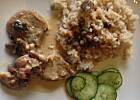 Pychota! Ja na dno naczynia żaroodpornego dałam ryż z sosem pieczarkowym, na to schabik z pieczarkami i boczkiem. Wszystko zalane śmietanką.