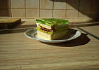 Oczywiście nie obeszło się bez odrobiny modyfikacji bo ja zawsze coś muszę od siebie dołożyć. Tak więc biszkopt upiekłam z 5 jaj bo miałam jaieś takie tyci jajeczka i bałam się, że z 4 może być za niski, do masy budyniowej, jeszcze ciepłej, wmiksowałam kostkę margaryny Kasi, bo ja zawsze tak robię masy budyniowe, no i na wierzch zamiast bitej śmietany ułożyłam banany i zalałam je galaretką agrestową, 2 galaretki na 3 szklanki wody...i wyszło coś takiego