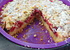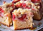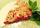 Niepozorna tarta z rabarbarem wytaplanym w kisielu truskawkowym i kruszonką.