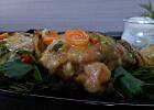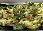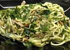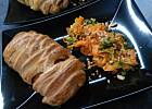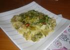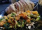 Filet z piersi kurczaka z nadzieniem (ser wędzony,żurawina,uprażone orzechy),zawinięty w ciasto francuskie,upieczony,podany z tagliatelle z cukinii i marchewki,zrobionym na maśle,z czosnkiem natką pietruszki i orzechami :)
