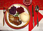Rosół z lanymi kluseczkami, pieczone udko z kaczki marynowane w cytrynie, pyzy wielkopolskie, buraczki zasmażane i czerwona kapusta. :)