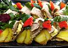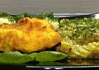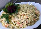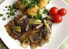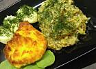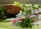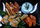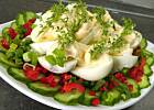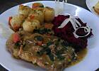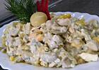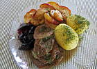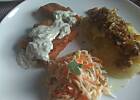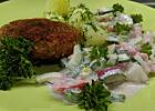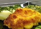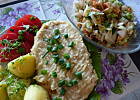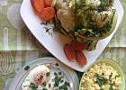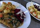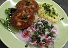 ziemniaki z pieczarkami, kostka z mintaja panierowana z sosem jogurtowym, surówka z selera marynowanego ...
