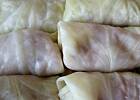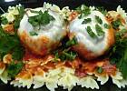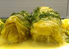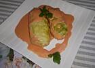 Gołąbki z młodej kapusty. Farsz cielęco-ryżowy, sos; śmietana 30% i passata pomidorowa.
